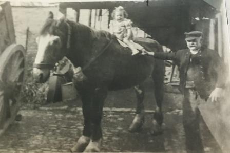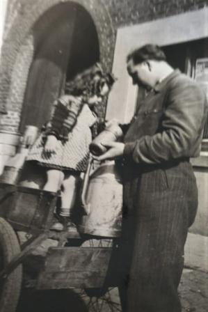 Hier ist Peter Winkens sen. bei der Lieferung der Milch an eine kleine Kundin in der Bendstraße vor der Einfahrt des Hofs Braun zu sehen.