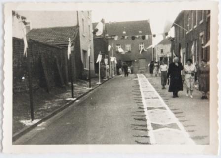 Auf dem Bild oben ist in der Mitte der Straße der Sandteppich zu sehen. Jedes Jahr wurde zu Fronleichnam von der Familie Schönen/Diederen gelegt. Die gesamte Nachbarschaft war beteiligt. Die Arbeiten begannen bereits im Morgengrauen. Der Sand wurde mit Farben gemischt, die bei Horbach in der Nordstraße gekauft wurden.